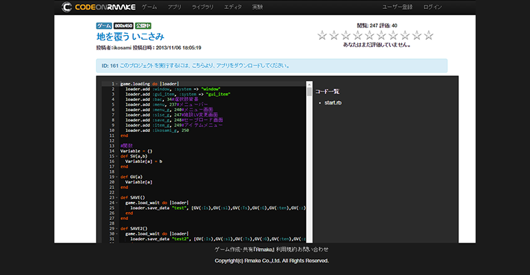 Code on Rmakeは、2013年7月17日に公開されたゲーム向けプラットフォームです。 mrubyを使ってスマホ/PC向けに簡単な記述で高度なゲームを開発できるエンジンと、ソースコードや素材を共有する配信サーバを備え、ゲームを手軽に学んで作って遊ぶことができます。